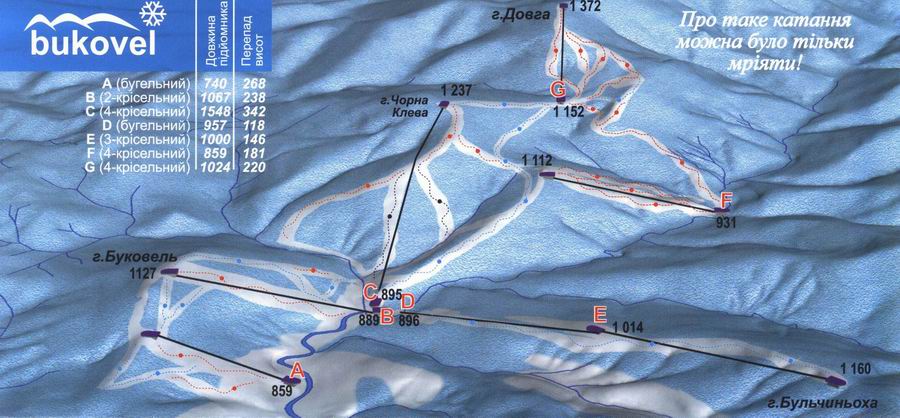 Bukovel's base elevation is nearly 900 m above sea level, and the highest ski lift rises to 1370 m (see map of Bukovel), making Bukovel the second highest ski resort in the Carpathians. All categories of difficulty are available. There is a very long gradual slope that is perfect for beginners, various short tows for children and "super-beginners," many intermediate runs to choose from, and several black diamonds. Night skiing is available from 5:00 to 8:00 p.m., but currently only on one slope that is upper intermediate. Bukovel is growing rapidly, and new equipment and runs are being added each year. Bukovel lift passes and ski rentals